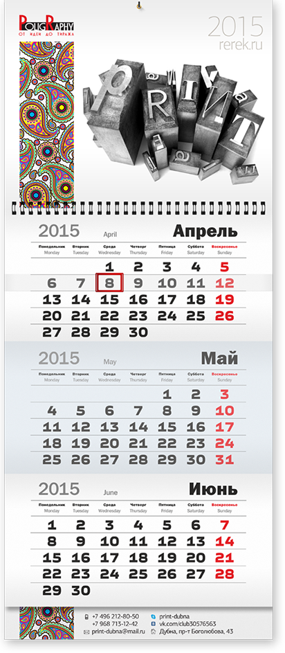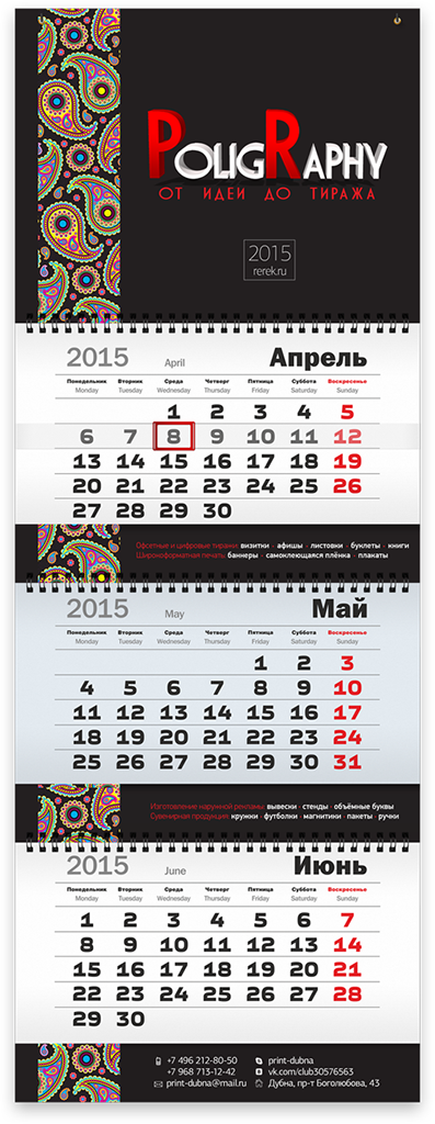 Срок изготовления 5-7 рабочих дней. Дизайн календаря в стоимость изготовления не входит. Стоимость печати с индивидуальными календарными блоками выше.